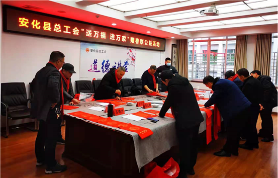 2月4日下午,安化县总工会在办公楼前坪开展“送万福 进万家”赠春联书法公益活动。(邓安民/摄)