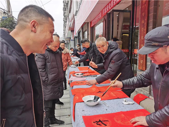 连日来,桃江县总工会联合桃江县楹联学会、桃花江文化研究会分别在桃江县经开区、灰山港工业集中区、县城文化路和建设路路口开展“送万福 进万家”送春联书法公益活动。(李丹/摄)
