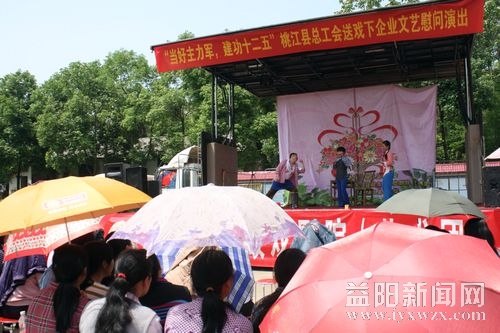5月13日,大红的腰带、五彩炫丽的焰火,舞蹈《开缸酒敬劳模》让工作在桃江县浮邱山乡近仑村和茂鞋业一线的几百名农民工朋友欢喜雀跃,连声赞好。这是桃江县总工会开展“当好主力军,建功‘十二五’”送戏下企业文艺慰问演出活动的第一站。