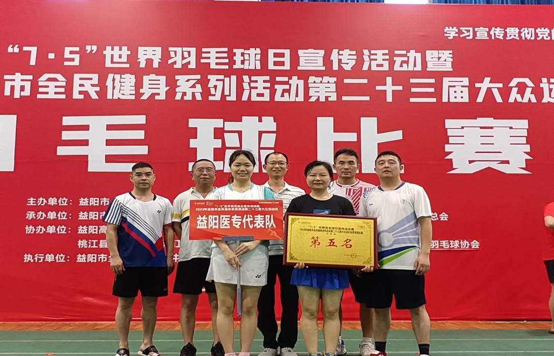 “7·5”世界羽毛球日宣传活动暨2023年益阳市全民健身系列活动第二十三届大众运动会羽毛球比赛在益阳市全民健身服务中心举行。益阳医学高等专科学校选派10名队员参赛,由党委委员、副校长贾平领队。最终,获得市直组第五名的好成绩。