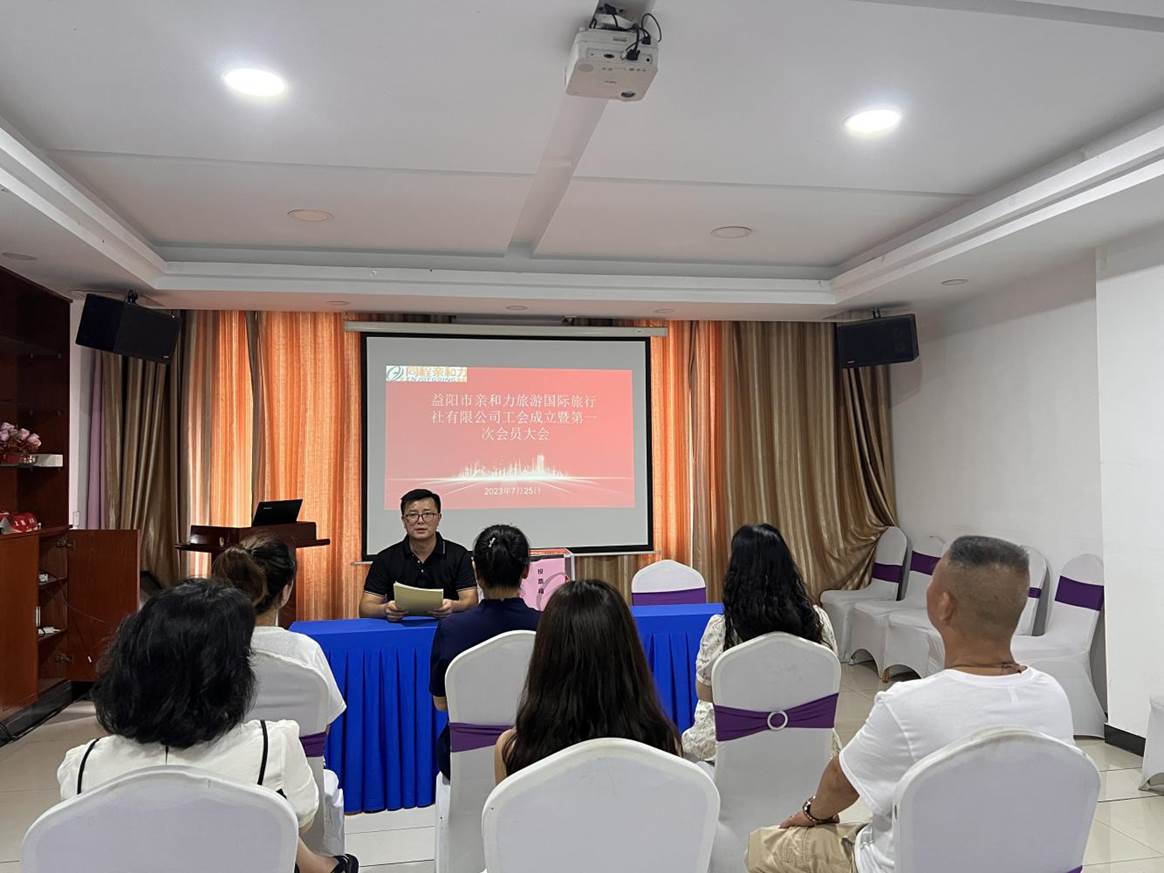 7月25日,益阳市亲和力旅游国际旅行社有限公司召开工会成立暨第一次会员大会,大会由公司总经理文鹤主持,全体员工参加。