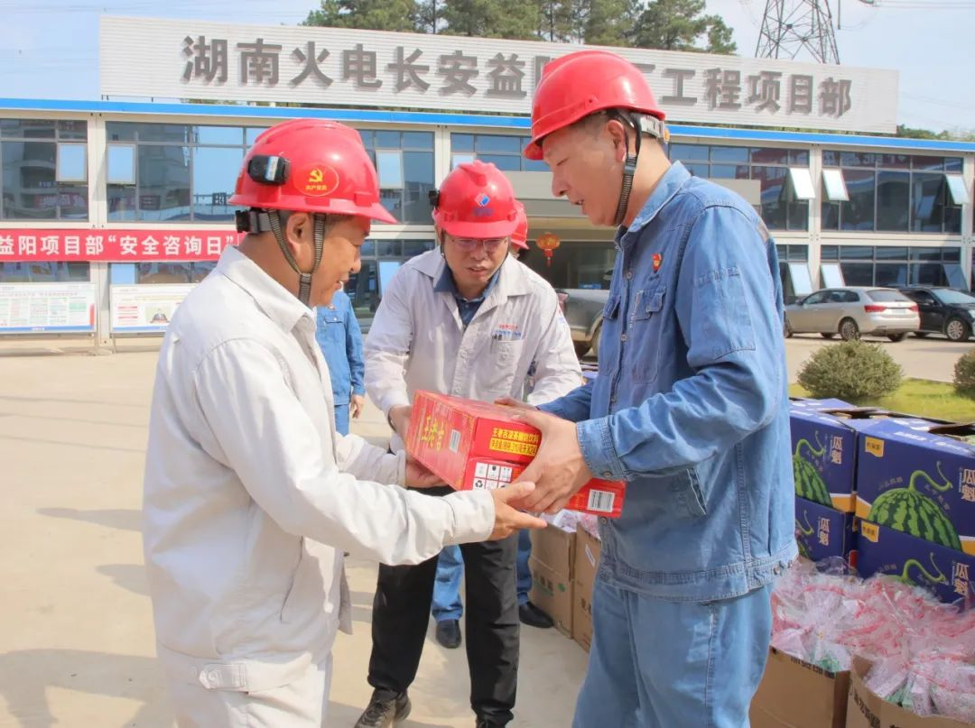 入伏以来,湖南气温持续走高,7月25日,长安益阳发电有限公司党委副书记、总经理吴磊,副总经理黄一铭、工会主席吕琳、纪委书记李毅华带队,深入公司三期2×100万千瓦扩能升级改造项目现场,为奋战在项目一线的广大干部职工送去亲切关怀与丝丝清凉。