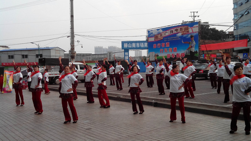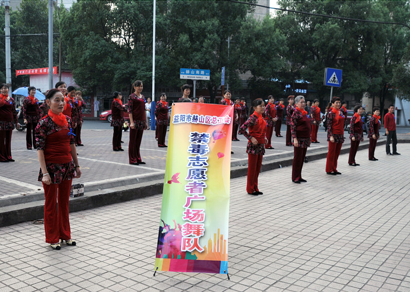 10月20日,赫山区总工会禁毒志愿者广场舞队在人口密集的南市场广场进行了广场舞禁毒宣传表演。舞者胸前佩戴蓝结标志,颈系红丝带,穿着统一禁毒服装,边舞动边高呼“珍爱生命 拒绝毒品”等禁毒口号,围观群众近百人。