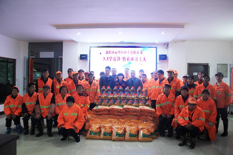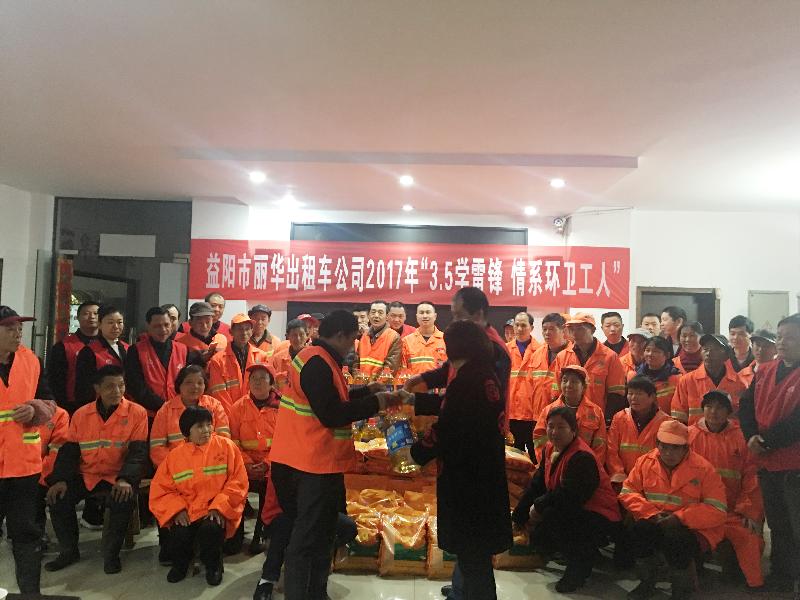 丽华雷锋车队成立于2010年9月,是我市第一支、也是目前出租车行业唯一一支雷锋车队。雷锋车队自成立之日起,就时刻以雷锋为榜样,经常性地开展学雷锋做好事、爱心送考、扶危济困等公益活动,逐步成为我市出租车行业一块响当当的品牌,相继荣获湖南省和全国“工人先锋号”等20多项殊荣。今年3月我市“全民学雷锋,共创文明城”3·5学雷锋志愿服务行动月启动后,丽华雷锋车队队长周胜蛟和他的队友们一合计,决定在3月5日学雷锋主题活动当天,组织一次环卫工人慰问活动,并且打算放下方向盘,拿起扫帚,角色转换当一回环卫工人,以此体验环卫工人工作的快乐与艰辛。雷锋车队的计划,当即得到市政协委员、公司董事长赵丽春的重视与支持。公司马上与赫山环卫处取得联系,安排与公司所在地滨江路沿线的环卫工人展开联谊,公司还早早地准备了送给环卫工人的慰问品。