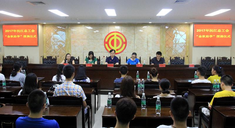 8月23日上午,沅江市总工会举行2017年“金秋助学”受助仪式。沅江市总工会“金秋助学”活动连续开展了13年,全市各级工会共筹资280余万元,资助829名困难职工家庭子女圆大学梦,已成为工会组织扶贫帮困、服务民生的爱心品牌,社会各界奉献爱心、传播爱心的良好平台。