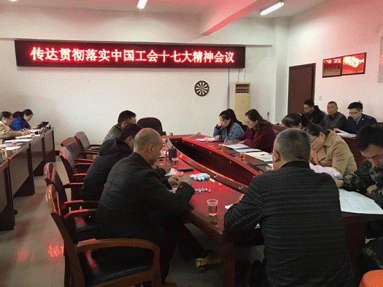 会议介绍了中国工会十七大召开的总体情况,指出这次大会是在我国进入全面建成小康社会决胜阶段、中国特色社会主义进入新时代召开的一次重要会议,是全国工会和亿万职工群众政治生活中的一件大事,对于推动新时代中国工运事业新发展具有重大的意义。会议认真学习了习近平总书记关于工人阶级和工会工作的“八个坚持”重要论述精神,李克强总理经济形势报告、王沪宁代表党中央发表致辞以及王东明主席所做的工作报告主要精神,并学习了《中国工会章程》最新修改的主要内容。