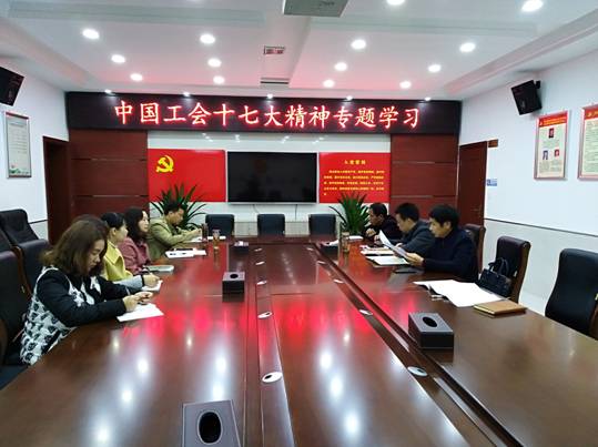 会议传达学习了中国工会第十七次全国代表大会的主要内容。认真学习领会习近平总书记与中华全国总工会新一届领导班子成员集体谈话精神、党中央致辞的主要精神、李克强总理所作经济形势报告的精神、王东明同志代表全总第十六届执委会向大会所作报告的精神、《中国工会章程(修正案)》的主要精神。