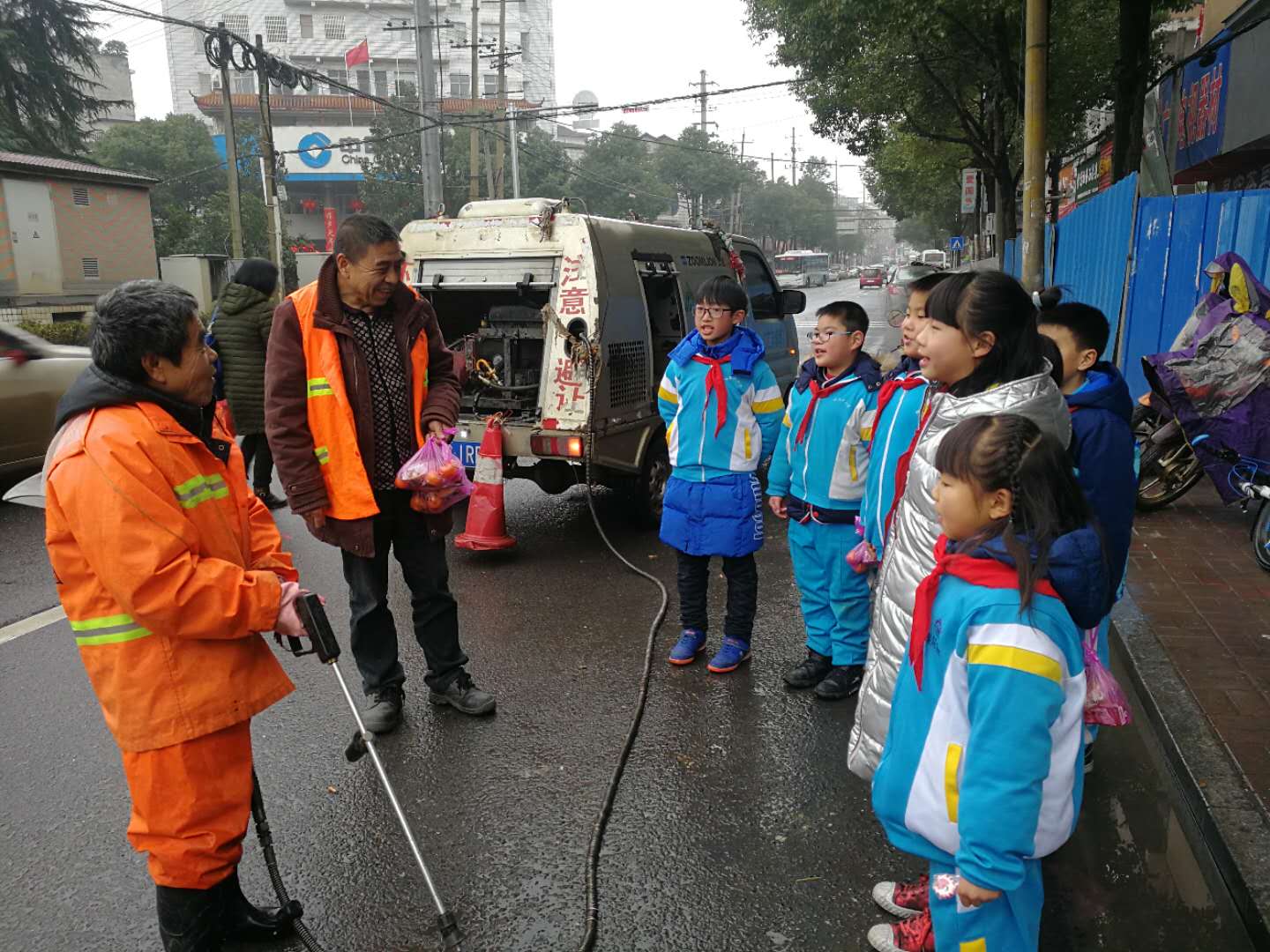 早晨6点,桃江县城的气温低至2℃左右,天空还下着濛濛细雨。此时,195班的同学们手捧早餐站立在湘运车站一旁,等待着司机叔叔。当一辆辆公交车进站时,孩子们纷纷上车送上水饺。下午两点,学生们又为县城15个点47名环卫工人送上了慰问品。起早贪黑的环卫工人收到小朋友的慰问品后特别激动,连连感谢老师和可爱的孩子们。