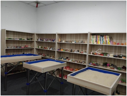 在沙盘游戏区,员工可从玩具架上自由挑选玩具,在盛有细沙的特制箱子里玩游戏。目前,游戏区共收纳了人物类、动物类、植物类、建筑物类、家居与生活用品类、交通运输工具类、石头贝壳类、景观与场景类等玩具一千余件。