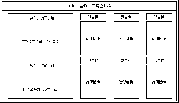 注:图1正上方矩形框为标题栏,一般名称为“(单位名称)厂务公开栏”。企(事)业单位厂务公开领导小组、小组办公室、厂务公开监督小组和厂务公开意见反馈电话为厂务公开栏中固定内容。厂务公开栏的插槽内可放置活动的公开内容,标题由企(事)业单位自行确定,一般包括企(事)业单位的生产经营管理情况、单位重大决策、安全生产和卫生情况、职工“五险一金”等福利情况、集体合同签订情况、单位评优评先情况、职工反馈意见处理情况。国有及其控股企业还应公布党风廉政建设、廉洁从业情况。