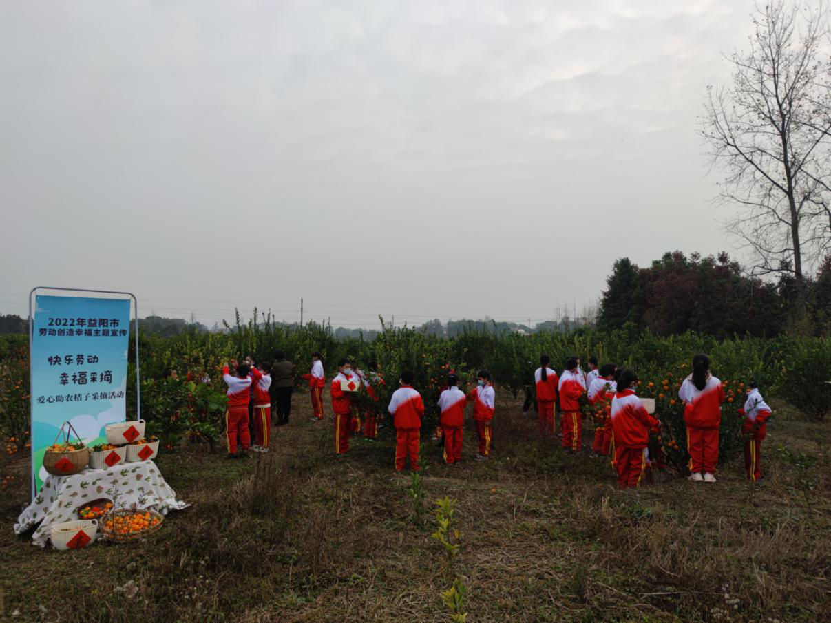 12月11日,益阳市总工会联合益阳市萤火虫社会工作服务中心,组织30多名学生开展“快乐劳动 幸福采摘”爱心助农摘桔子劳动实践活动。